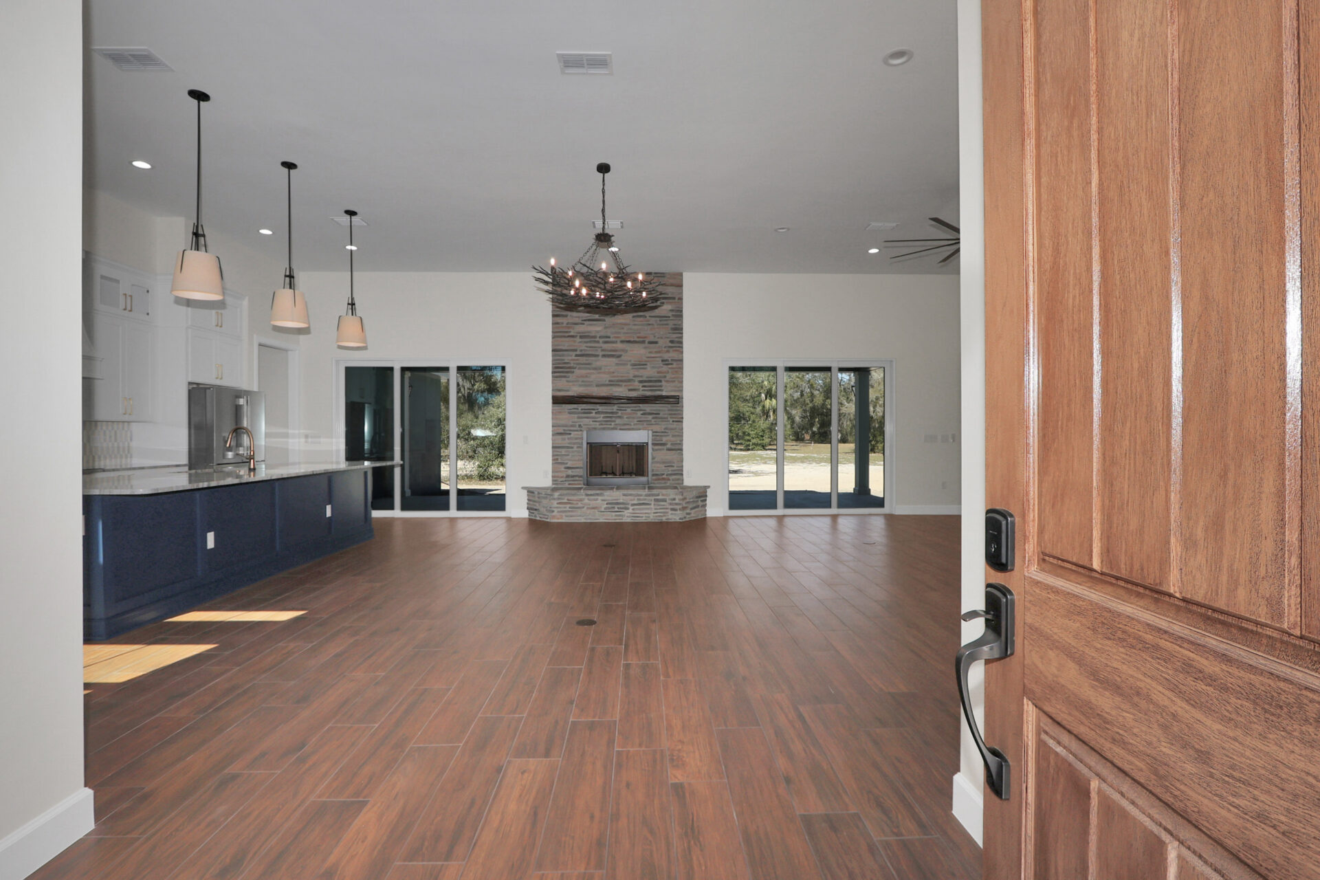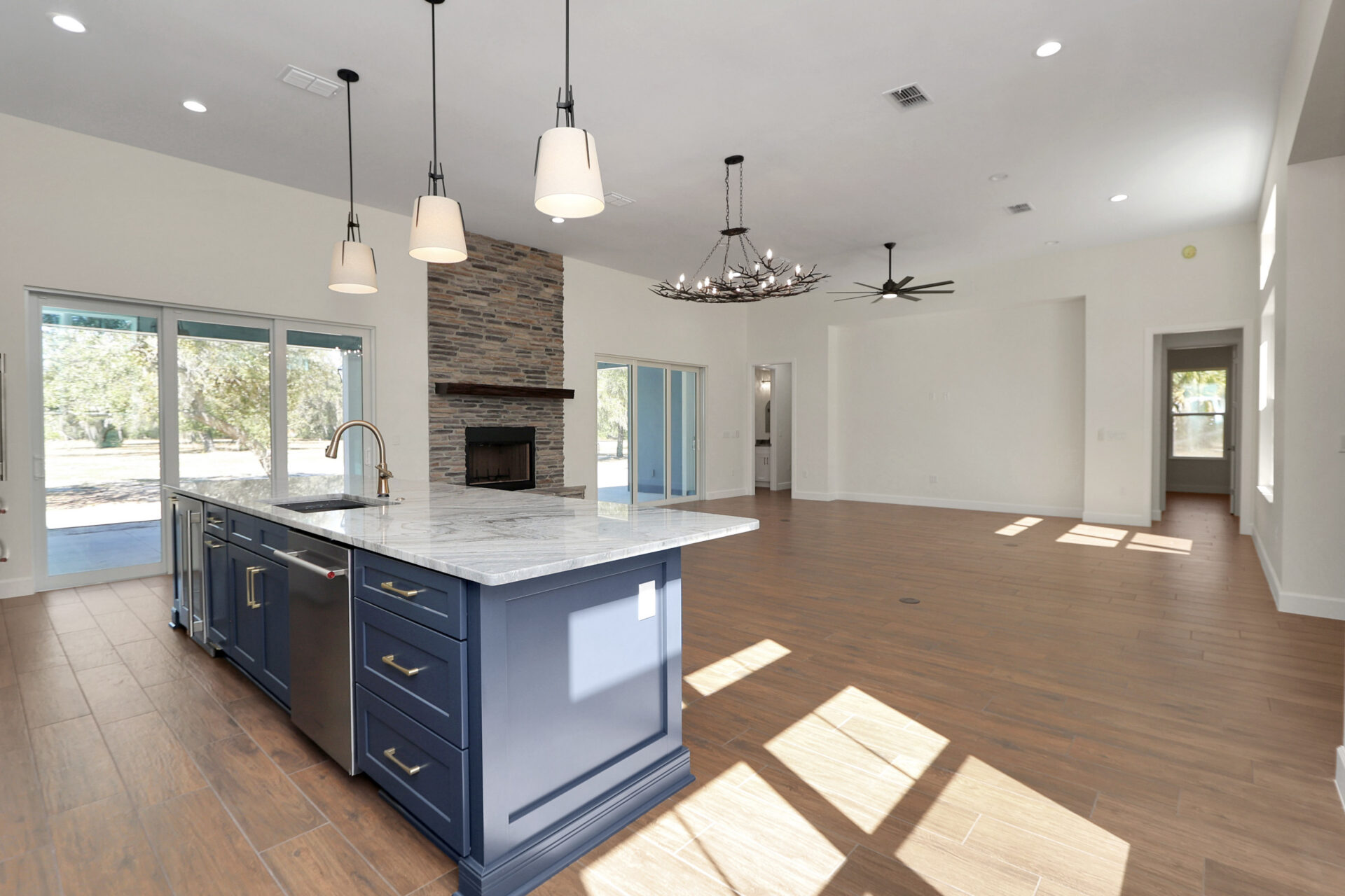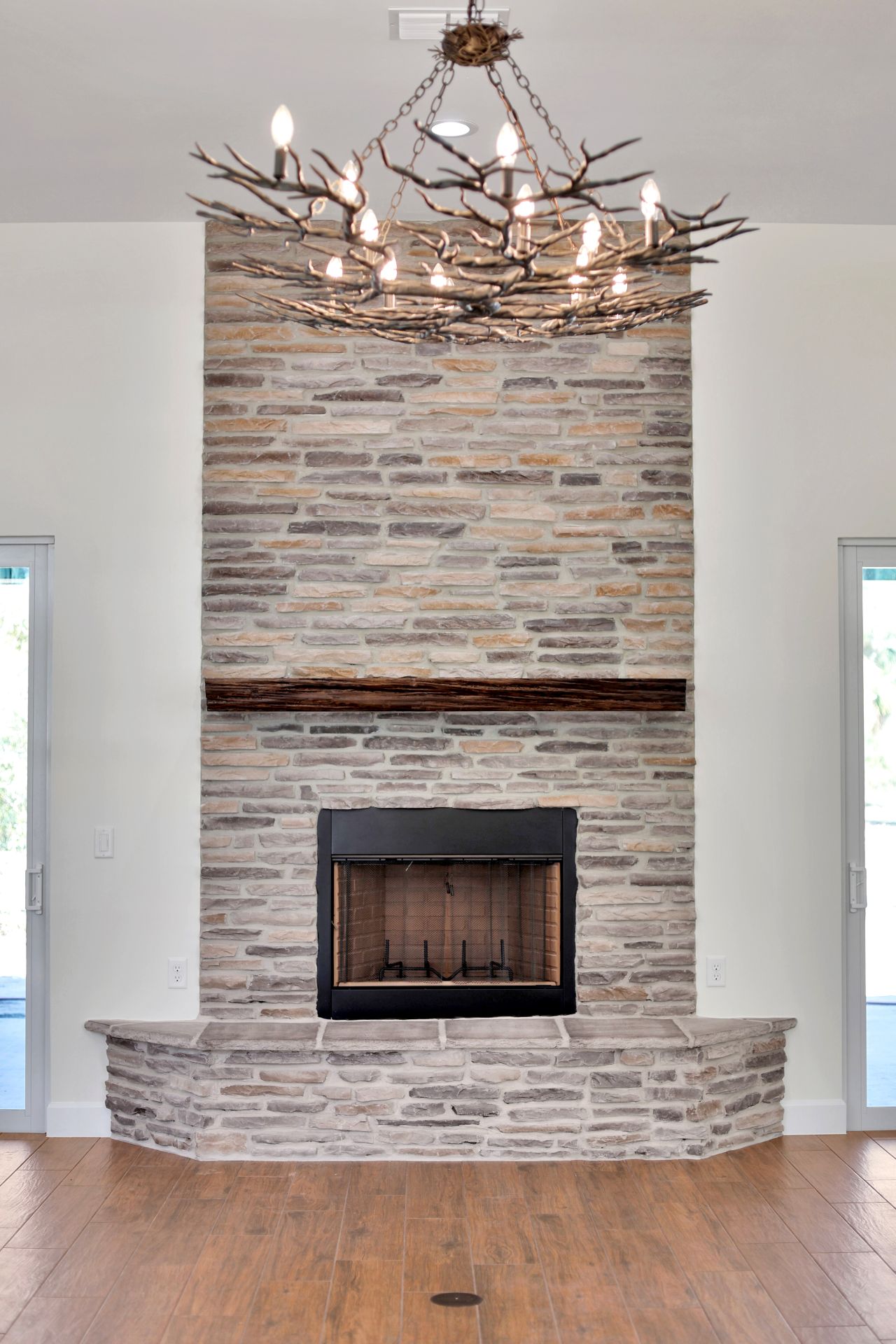 The open-concept living area is defined by a floor-to-ceiling multicolor stone fireplace paired with a beautiful rustic wood mantle. Because the fireplace is flanked by two sets of sliding glass doors, it draws the eye upward to highlight the height of the room.