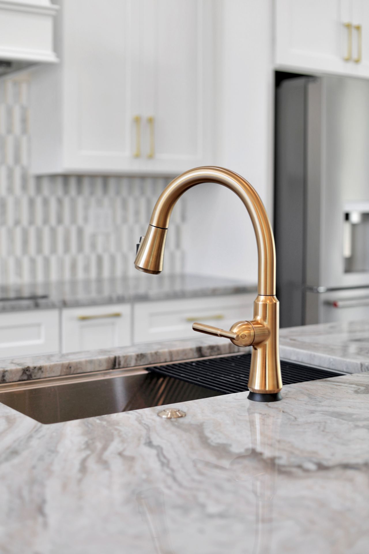 The kitchen is a masterclass in custom design, featuring crisp white cabinetry with gold handles and a stunning arched backsplash. This intricate feature showcases a half-white, half-grey pattern accented by gold trim. To complement this, a massive blue center island sits at the center, housing a wine fridge and integrated stainless steel appliances.