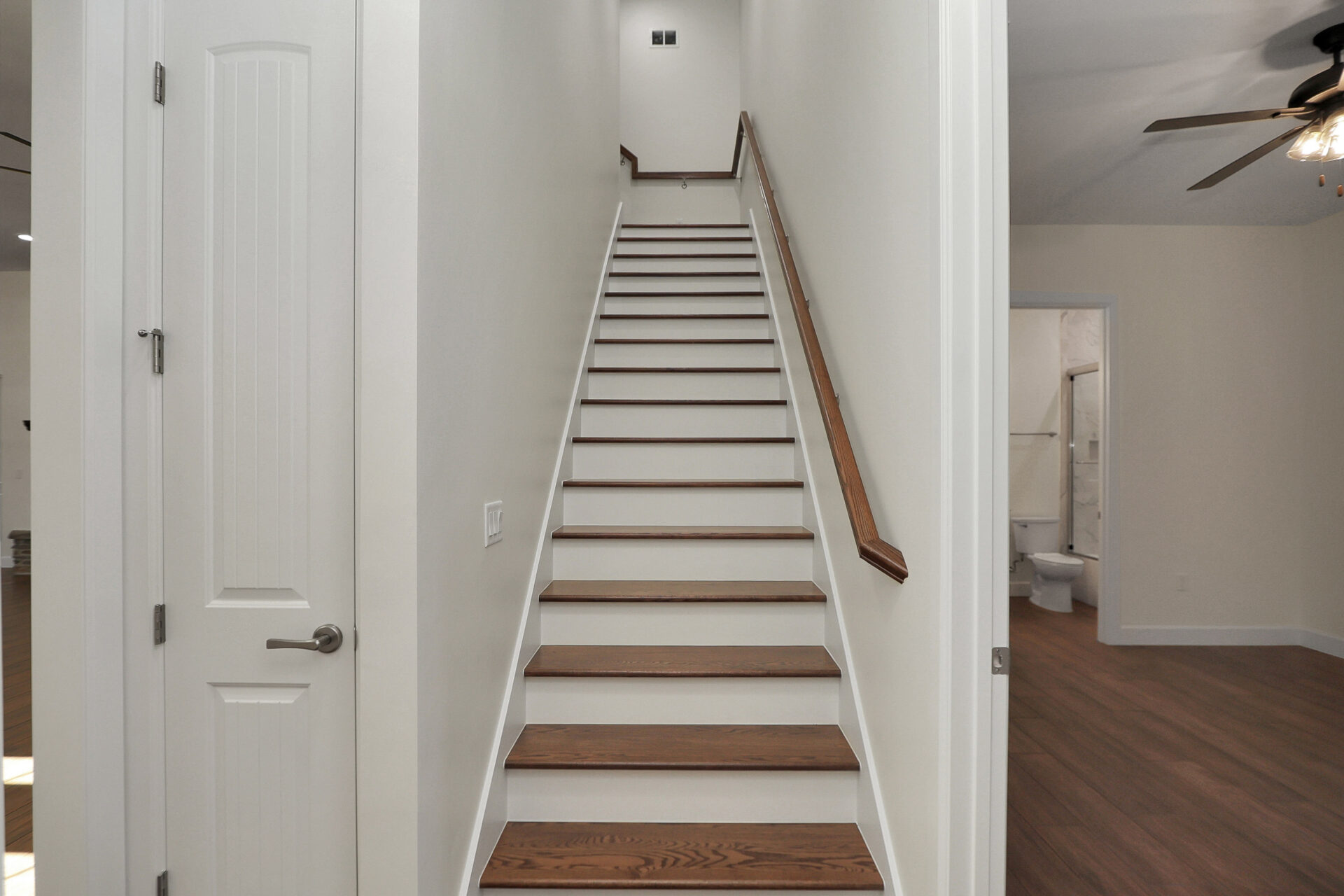 • Bedroom #3 is equally well-appointed, providing a standard closet and a private bathroom equipped with a full bathtub. Additionally, this hallway serves as the gateway to the upper level, housing the custom staircase that leads to the finished attic space.