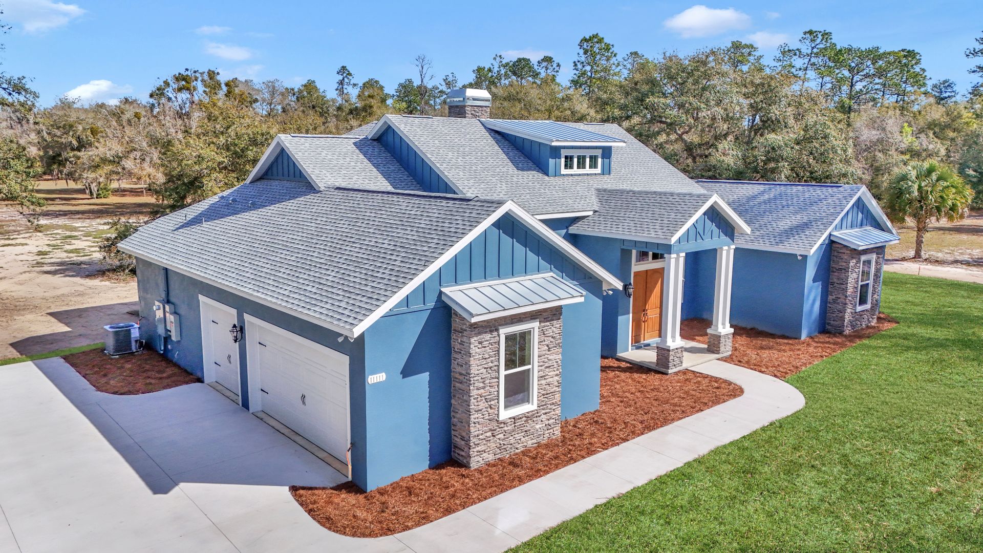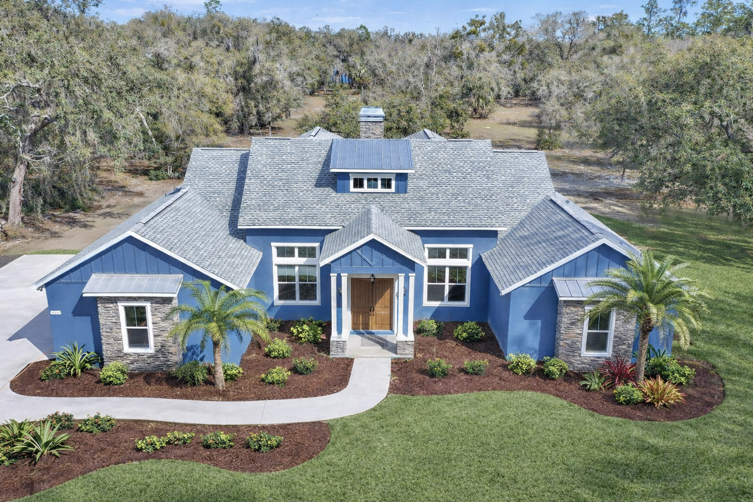 In contrast, the two windows on the extreme far sides of the home provide a rugged, custom aesthetic. Because these “anchor” windows are framed in sophisticated multicolor stone and topped with architectural overhangs, they create a beautiful visual balance across the front of the property. This design demonstrates why many homeowners choose a custom home builder in Ocala, FL to ensure every exterior detail reflects their personal style.