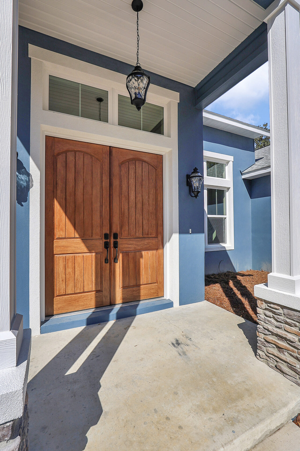 The exterior of this home immediately commands attention with its vibrant blue painted finish. Regarding the layout, the center of the home features a grand entrance with two stately white pillars supporting a covered entry. Specifically, this entryway leads to light-wood double front doors, which are flanked by two flat windows on each side. These central windows provide natural light to the kitchen and the great room respectively.
