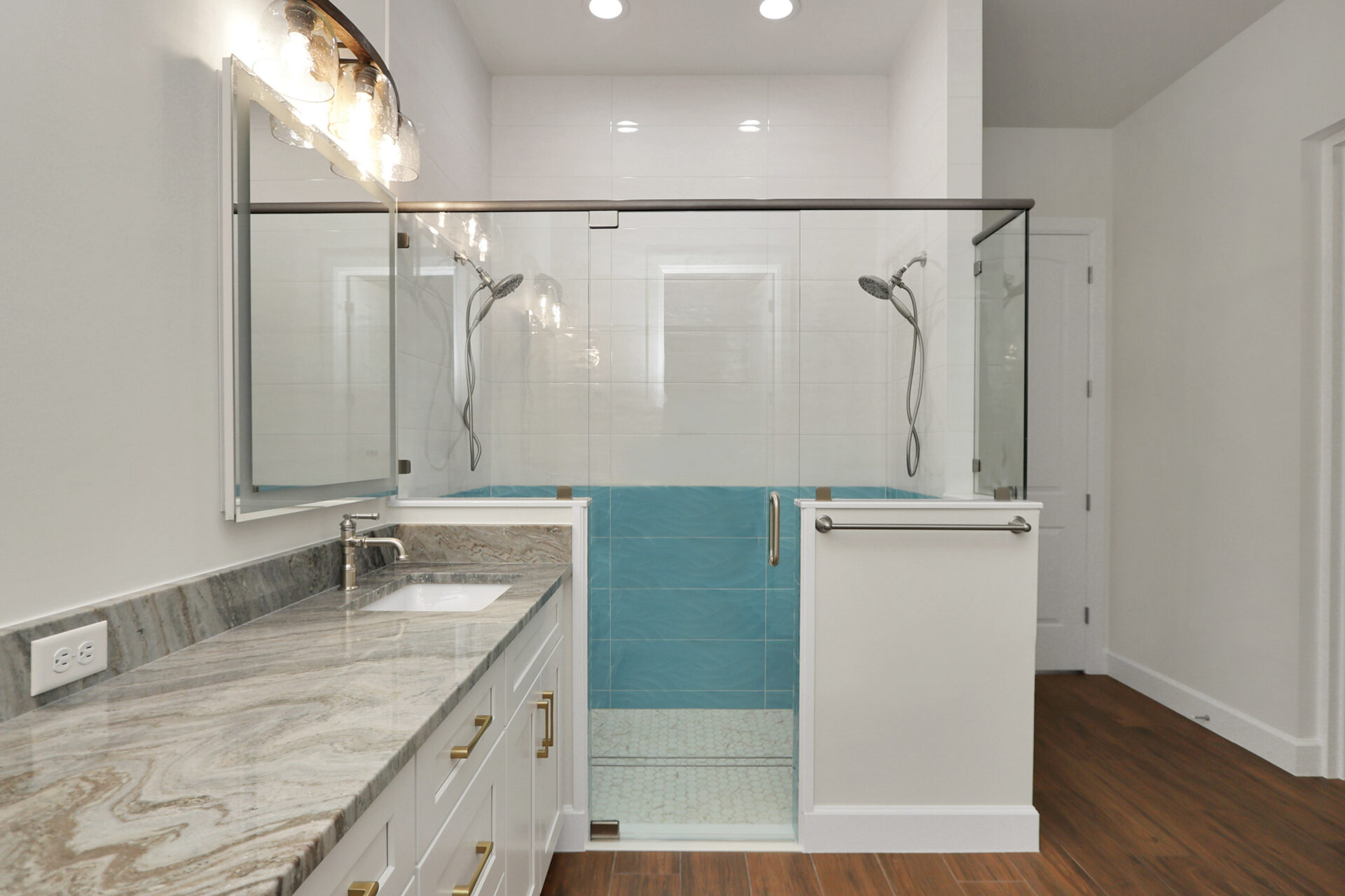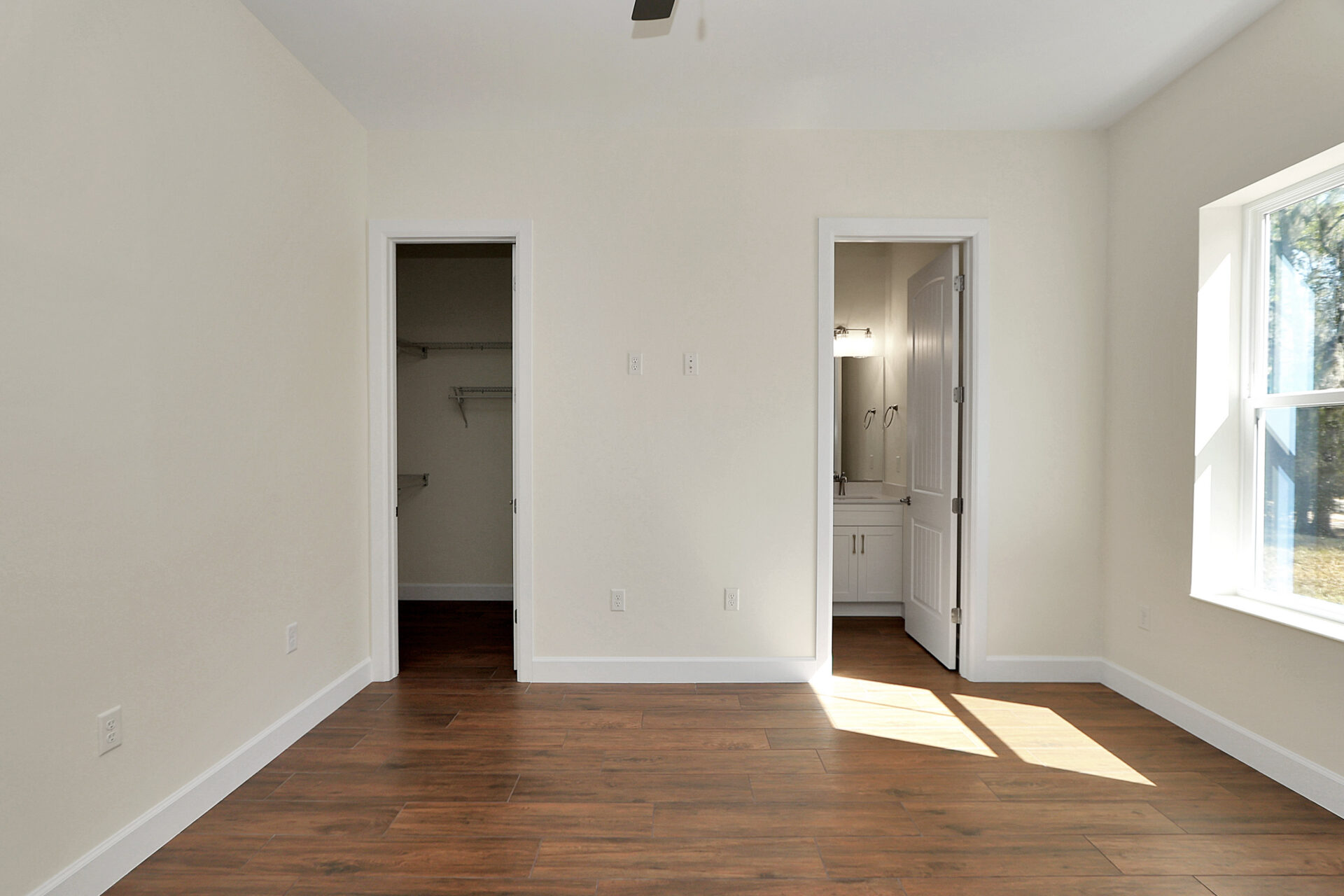 The master wing serves as a true sanctuary within the home, blending architectural elegance with total privacy. The master bathroom is designed for ultimate luxury and safety. It features a custom-tiled walk-in shower, a double vanity with premium fixtures, and two massive walk-in closets.