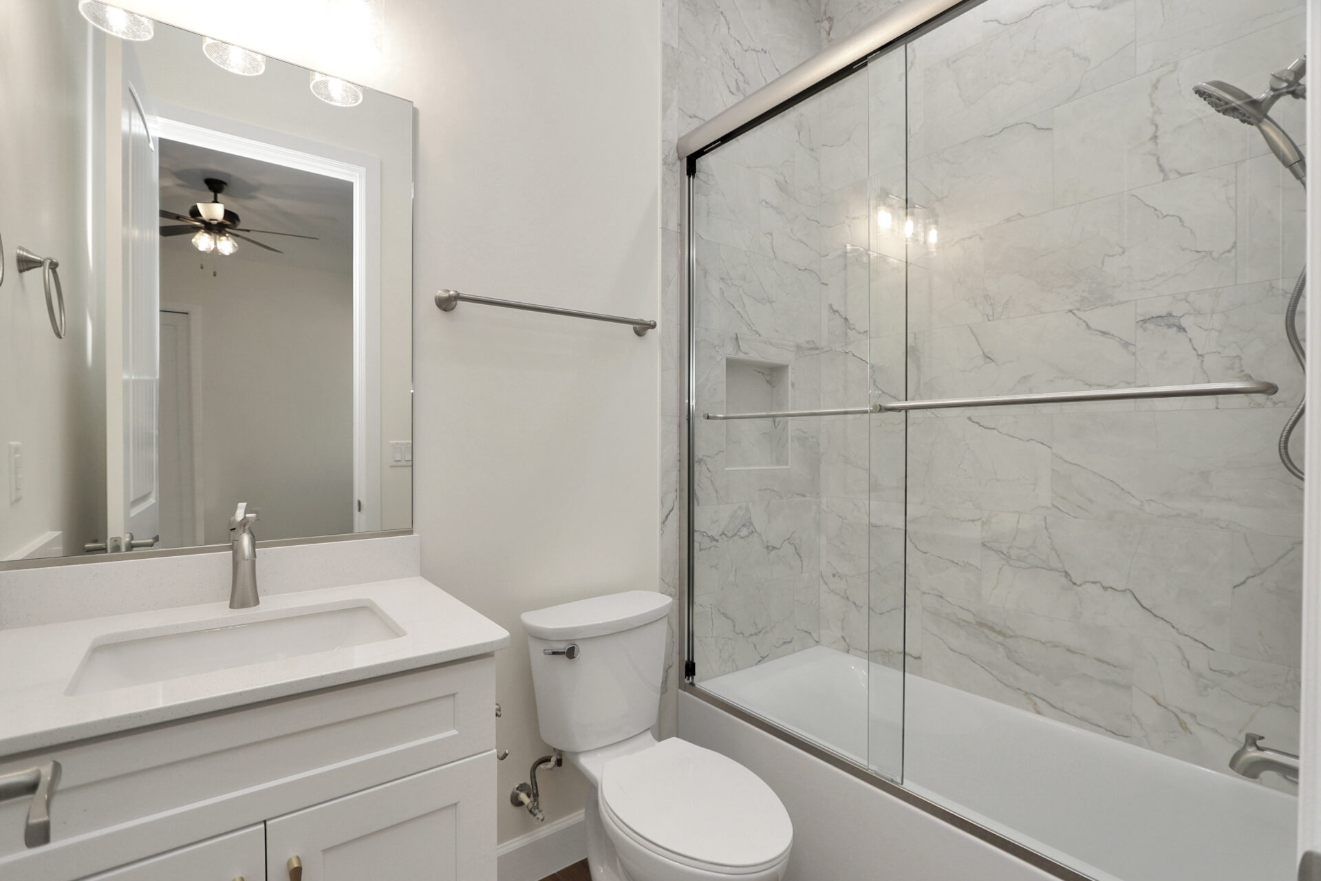 This bathroom is particularly notable for its “pool door” access to the lanai, making it perfect for outdoor entertaining. Furthermore, this wing maximizes the home’s footprint by including a deep storage closet tucked neatly under the staircase—a smart solution provided by Jason Boutwell Construction; your custom home builder in Ocala, FL.