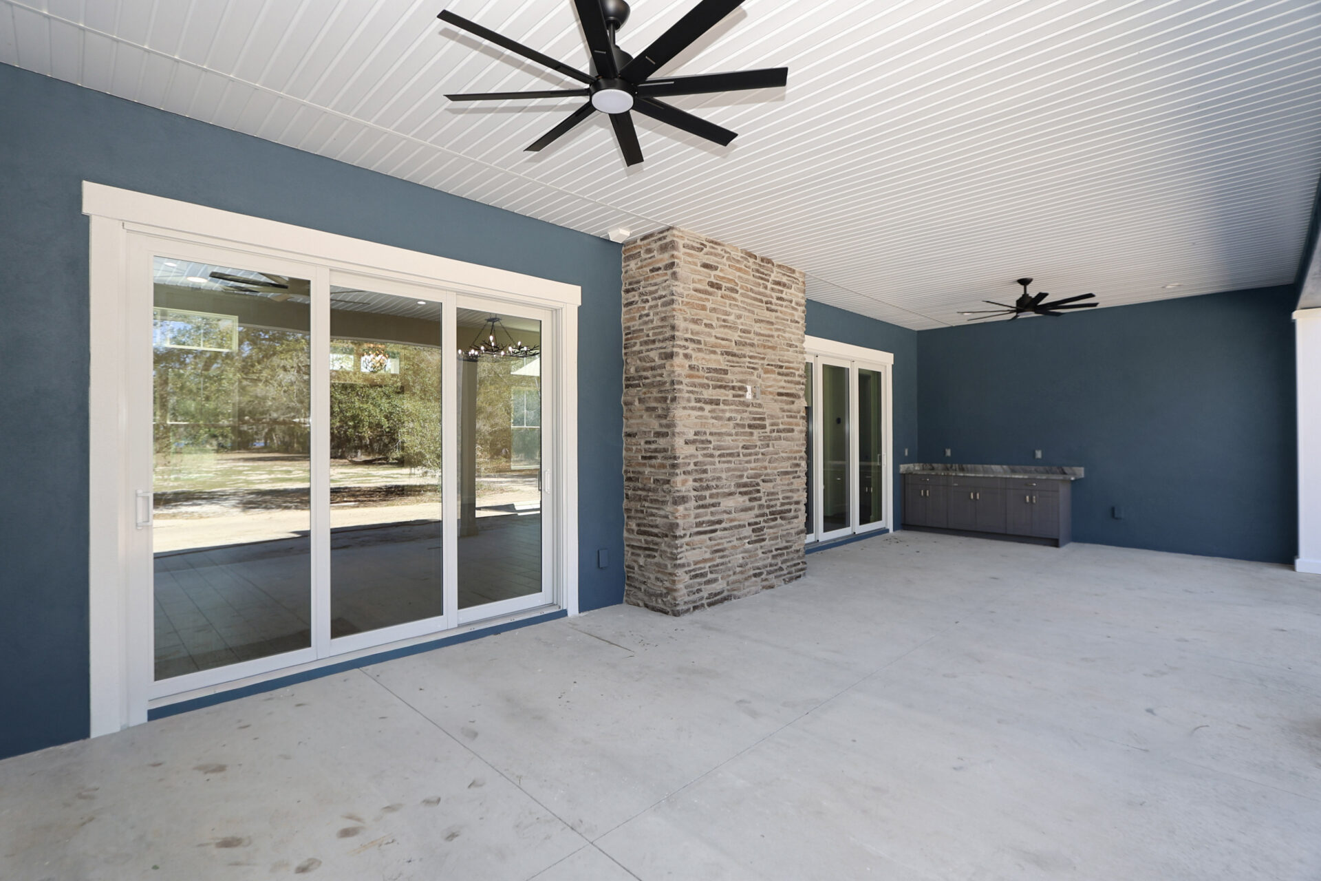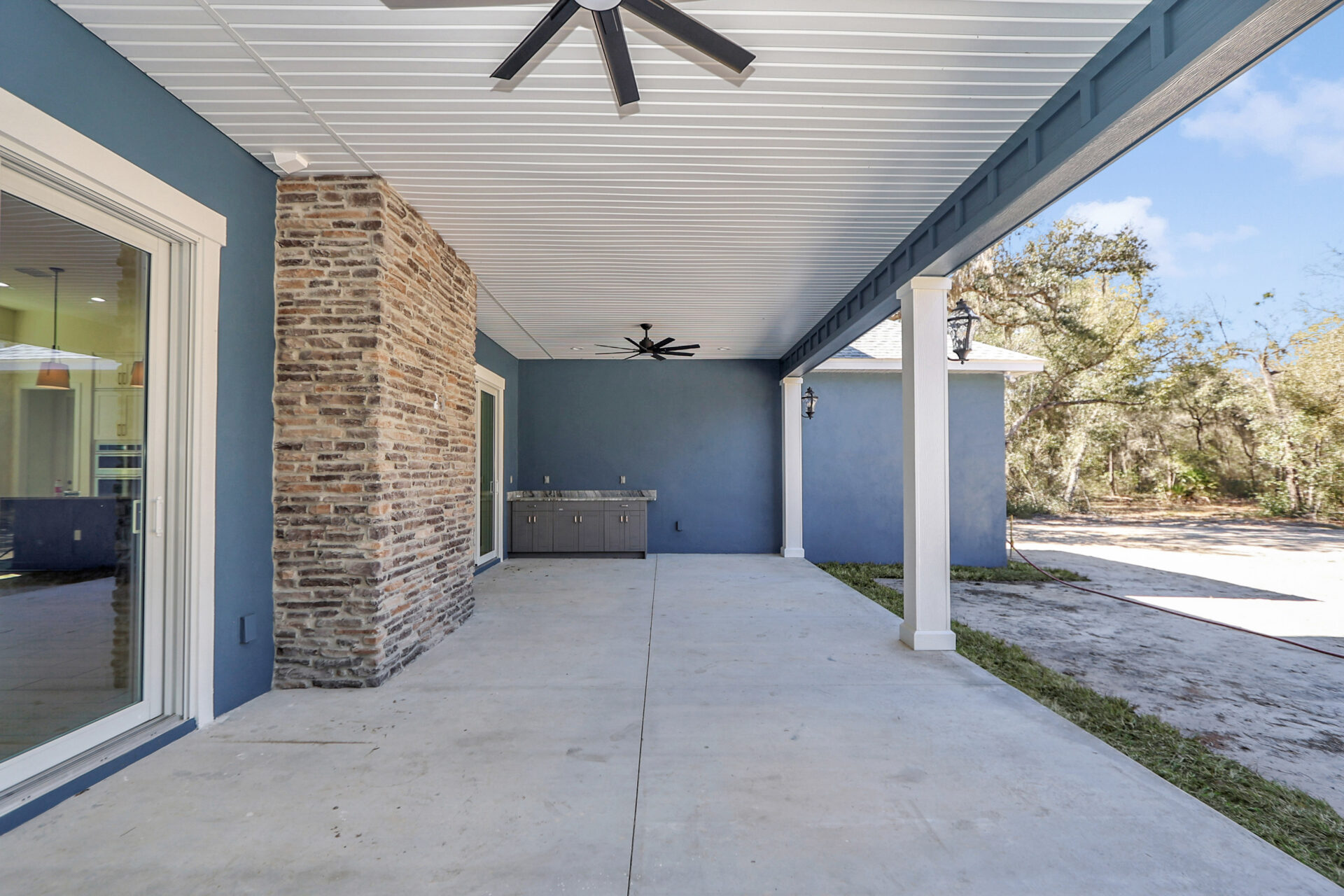 In contrast, the ground floor features a massive covered lanai spanning the full length of the home. This outdoor retreat includes a direct-access door to the fourth bathroom for added convenience during gatherings. Furthermore, the porch features pre-installed custom cabinetry and countertops, ensuring the space is perfectly prepared for a future outdoor kitchen.